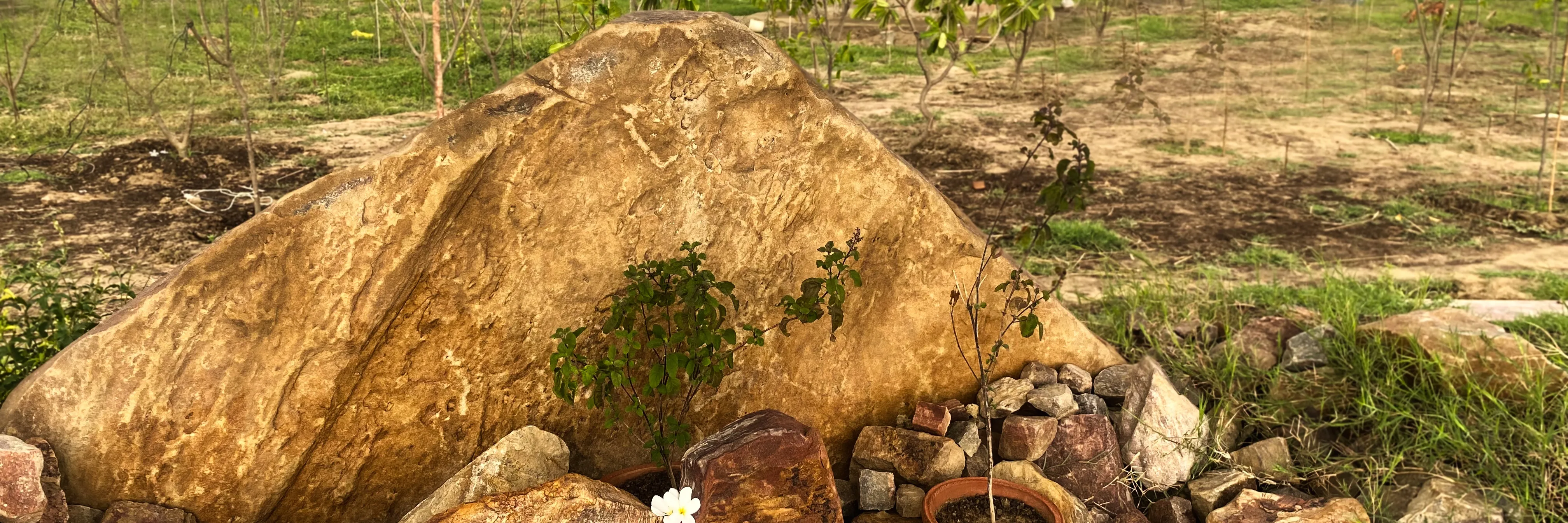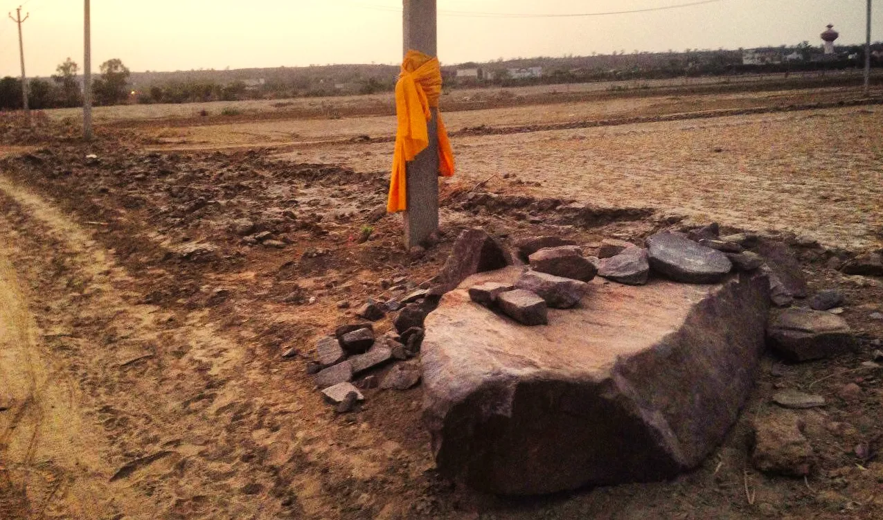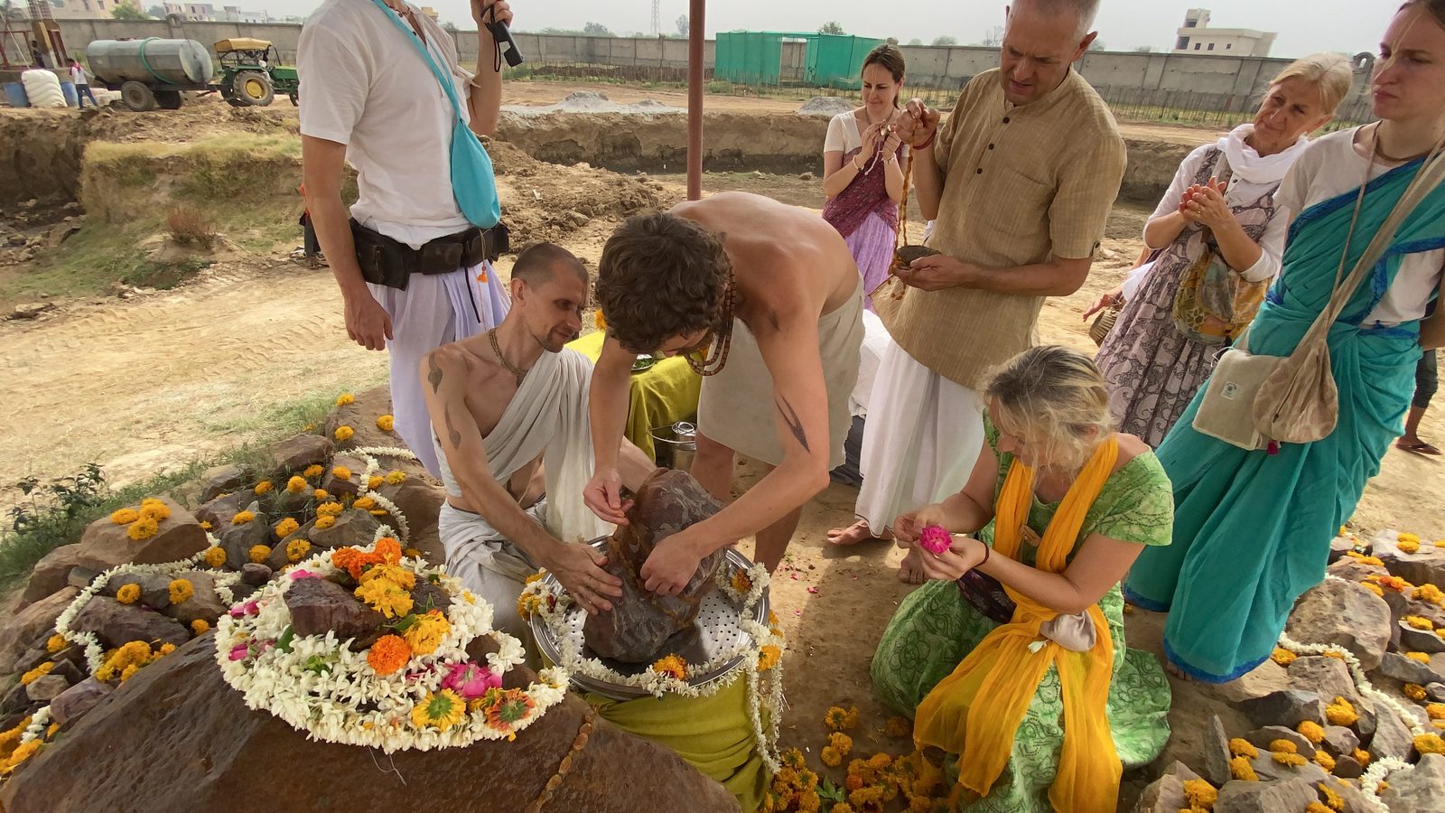 Да, это большая Говардхана-шила, причем не одна, а примерно с сотней шил меньшего размера. Они были аккуратно сложены на обочине дороги рядом с нашей землей. И местные жители сразу же начали им поклоняться, украсив лентами и поставив тилаки.