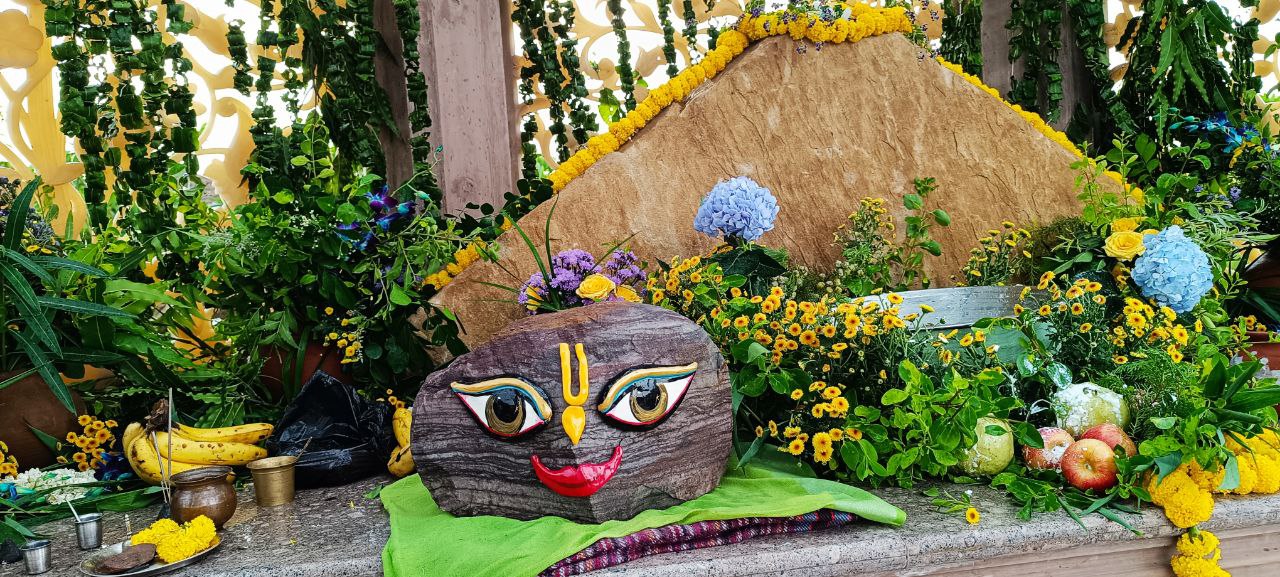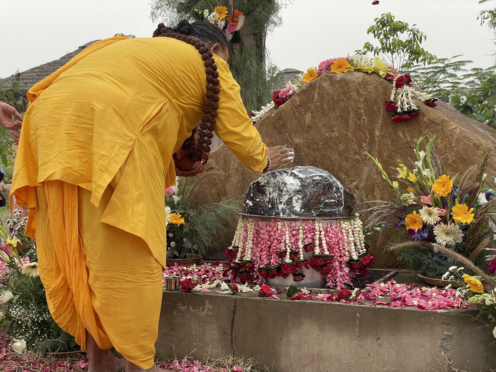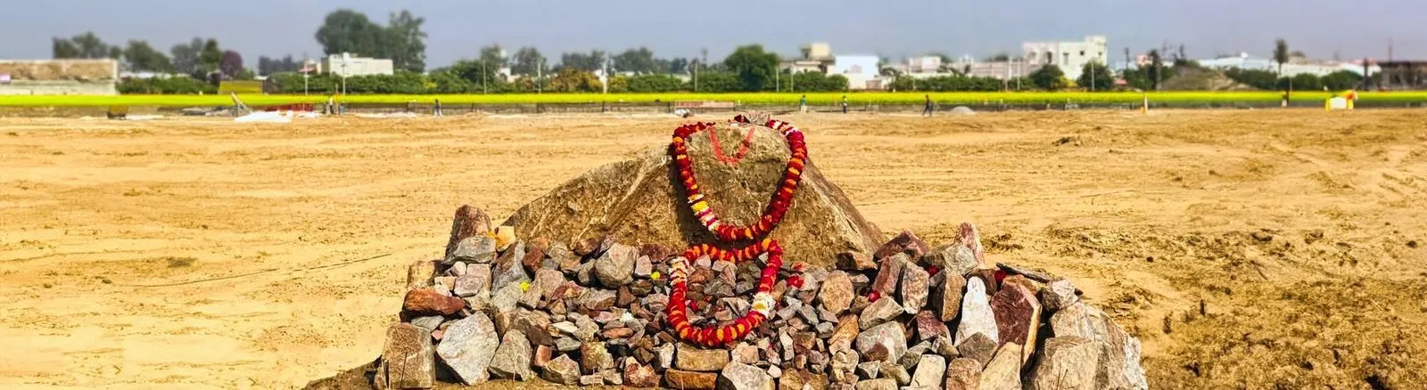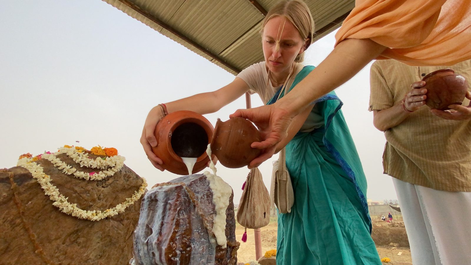 Да, это большая Говардхана-шила, причем не одна, а примерно с сотней шил меньшего размера. Они были аккуратно сложены на обочине дороги рядом с нашей землей. И местные жители сразу же начали им поклоняться, украсив лентами и поставив тилаки.