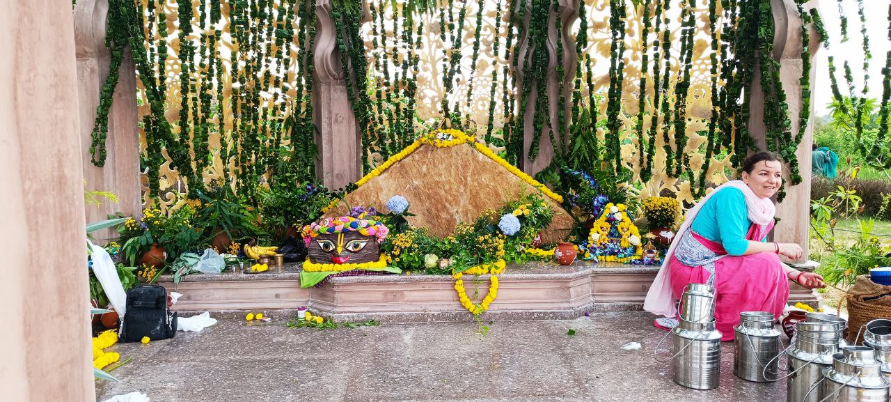 Нам же хочется думать, что просто Гирирадж захотел прийти к нам и по традиции добирался до места «автостопом». Так что первым делом мы перенесли Гирираджа в центр нашего участка и провели пуджу. А незнакомый местный мальчик старательно поставил самому большому Гирираджу тилаку.